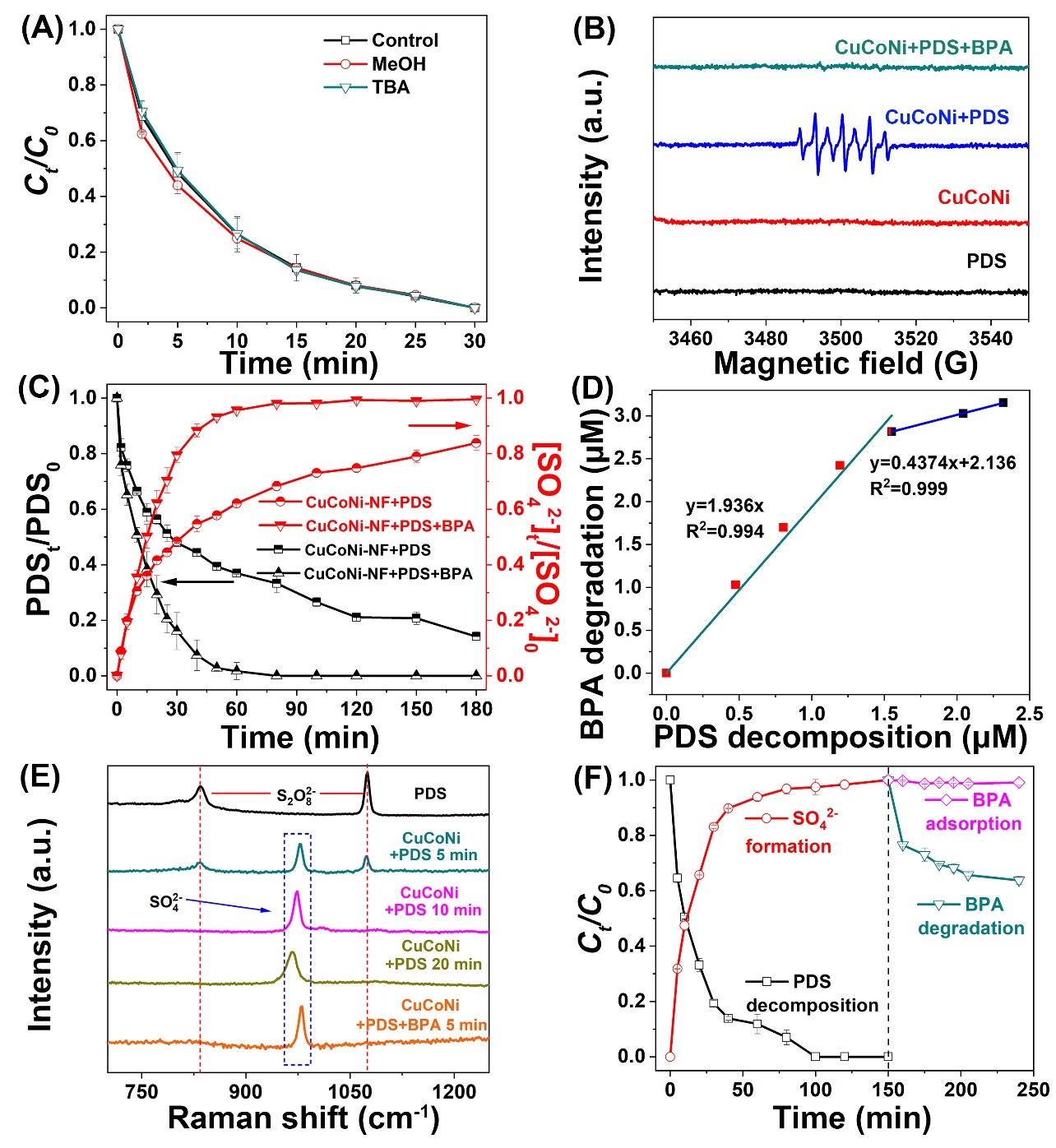 为进一步验证电子转移过程,我们构建了电化学氧化系统,将BPA和PDS分别置于两个半电池中。当连接两侧的CuCoNi-NF电极时,电子从BPA室不断转移至PDS室,系统产生明显的电流,在这个过程中BPA被氧化分解,而PDS转化为SO42-,证明了BPA通过CuCoNi-NF电子介导体向PDS转移电子。此后,我们将BPA室的CuCoNi-NF电极(未与PDS接触)置于新鲜的BPA溶液中,发现BPA在没有PDS存在的情况下发生分解,该结果进一步表明氧化态CuCoNi-NF可以从BPA夺取电子,CuCoNi-NF在PDS活化过程中介导了电子的转移。