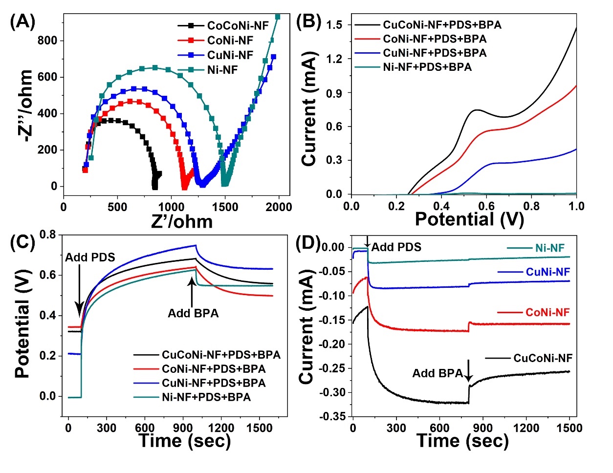 CuCoNi-NF材料界面电荷转移电阻较低,有助于加快PDS活化过程中的电子转移。线性扫描伏安分析结果显示,BPA在CuCoNi-NF上的氧化电位较低,且峰值电流最高,表明氧化态的CuCoNi-NF对BPA氧化速率最快。CuCoNi-NF的开路电位在注入PDS后迅速增加,表明CuCoNi-NF失去电子给PDS。随着BPA的加入,氧化态的CuCoNi-NF从BPA获得电子,使开路电位降低。计时电流分析结果显示,添加PDS后负电流增加,表明电子从电化学工作站向NF电极流动加快,是由于NF电极向PDS供出电子导致电极电位上升所致。而BPA的添加使负向电流下降,表明从电化学工作站向NF电极的电子流动减慢,是因为BPA将电子供给了NF电极。其中CuCoNi-NF催化剂的电流变化最明显,表明该催化剂在这一过程中的电子转移速度最快,因此对BPA降解效率最高。