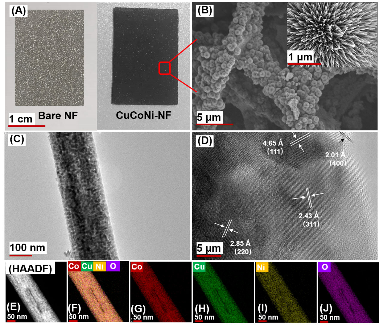 所制备的CuCoNi-NF催化剂以NF为基底,CuCoNi氧化物均匀生长在NF表面,呈现彼此独立的板栗微球形状,由从中心垂直向外生长的纳米线组成,Cu,Co,Ni和O元素在纳米线上均匀分布。