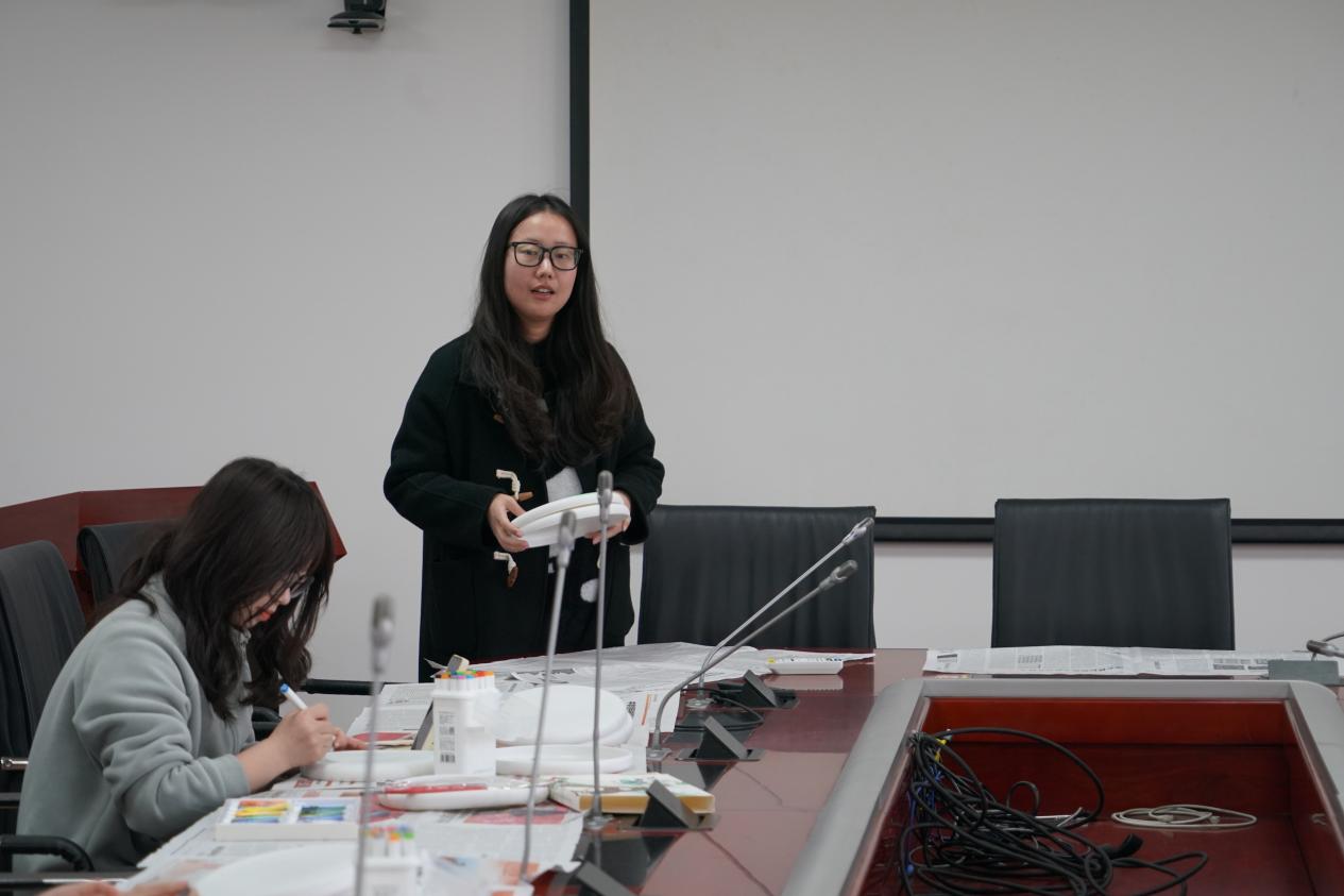 活动现场,桌面上整齐地摆放着色彩丰富的颜料、粗细不同的画笔以及崭新的飞盘,营造出愉快的创作氛围。张恂同学为大家讲解活动的注意事项,并展示了多款示范作品,为同学们提供了丰富的灵感。