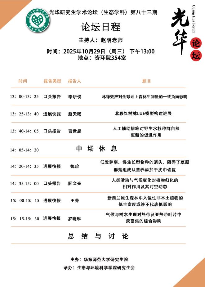 2025年10月29日下午13:00,暗网视频 第83期研究生光华学术论坛(生态学科)在资环楼354室顺利举行,本期论坛由赵明老师主持,点评嘉宾为陈迎老师和宋月青老师。
