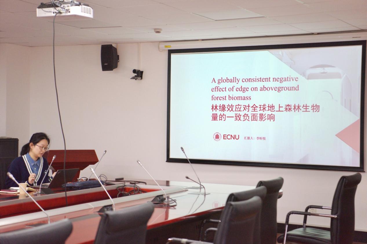 上半场的第一位汇报人是李昕悦同学,她进展快报的题目为《林缘效应对全球地上森林生物量的一致负面影响》,该研究探讨了全球森林破碎化催生的“林缘效应”及对其生物的负面影响。第二位汇报人是赵天旸同学,他汇报的题目为《北移红树林LUE模型构建进展》该研究对浙江红树林开展了长时序的碳汇功能检测,揭示了LUE响应的机制。第三位汇报人是曹世超同学,她汇报的题目为《人工辅助措施对野生水杉种群自然更新的促进作用》,她的研究表明人工辅助下的自然更新措施能够有效缓解水杉种群天然更新的早期限制,具有相关重大意义。