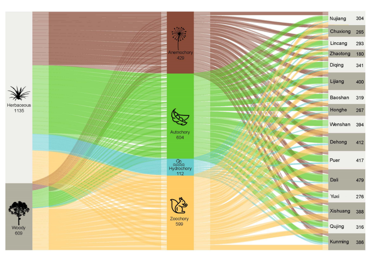 Figure 3 Sankey chart of species composition in 16 cities surveyed in Yunnan province, China. The number represent spontaneous species richness.