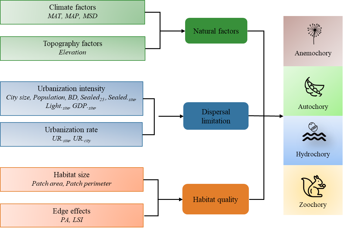 Figure 2 The conceptual framework of urban spontaneous plants with different seed dispersal modes and corresponding drivers of species richness. MAT: mean annual temperature; MAP: mean annual precipitation; MSD: mean annual duration of sunshine; Sealed.site: the proportion of impervious surface within site; Light.site: nighttime light intensity in each site; GDP.site: gross domestic product in each site; UR.site: urbanization rate in each site; UR.city: urbanization rate in each city; BD: distance of patches from city boundary; Sealed25: the proportion of impervious surface within radii of 25 m around the patch; PA: perimeter-area ratio; LSI: landscape shape index.