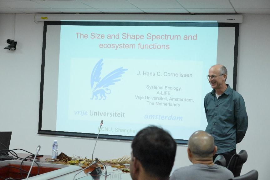 随后,Hans Cornelissen教授以“The Size and Shape Spectrum and ecosystem functions”(大小形状谱与生态系统功能)为题分享研究成果,解析植物大小、形态性状与生态功能的关系。他在报告中提到,当前学界对“植物经济型谱”的研究较为集中,这类性状主要影响植物生长与凋落物分解。而植物及其器官的大小与形状,同样在生态系统功能中扮演关键角色,由此构成“植物大小形状谱”(Size and Shape Spectrum)。植物及其器官在凋落阶段的“大小与形状谱”,也是驱动关键生态系统功能与服务的重要因子。Cornelissen教授还指出,该领域仍面临多项科学挑战:其一,在不同环境和生物群系中,进一步量化大小与形状谱与植物凋落物功能及服务的关系;其二,研究混合凋落层中的“大小与形状谱”(非加性效应);其三,加强对非叶器官/组织(如细枝、树干、树皮和根细)大小与形状谱的关注。