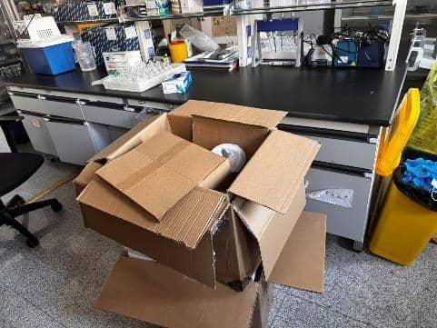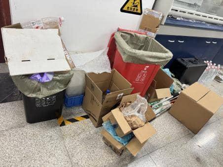 实验室物品堆放杂乱,闲置纸箱未及时清理;
