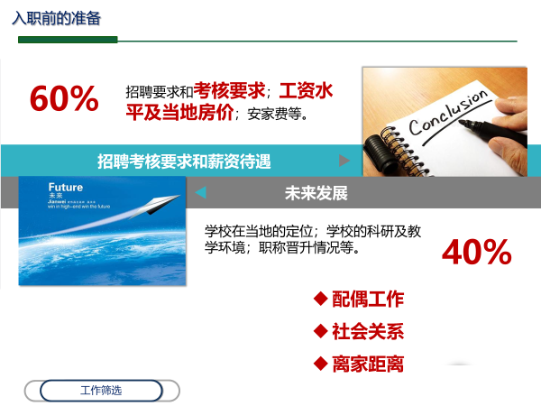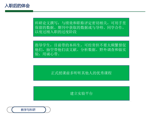 随后,作为一位已经成功上岸的“青椒”代表,就职于南阳师范学院的王家鸣同学从“应聘高校教师岗应如何准备”与“入职半年后的一些体会”两方面分享了他的求职经验。他首先对应聘中需要注意的,如何选择心仪高校、简历制作与投递、所需要的教学方面准备等进行了详尽的介绍。他建议选择高校的时候,可以从就业地域、未来发展和家庭生活这三个方面进行综合考虑。然后,针对入职之后需要注意的一些问题,展开细致的心得分享,包括职称评定、青年教师培养方案等文件以及了解政府及学校的人才服务政策等内容,从而成长为兼顾科研与教学的青年教师人才。