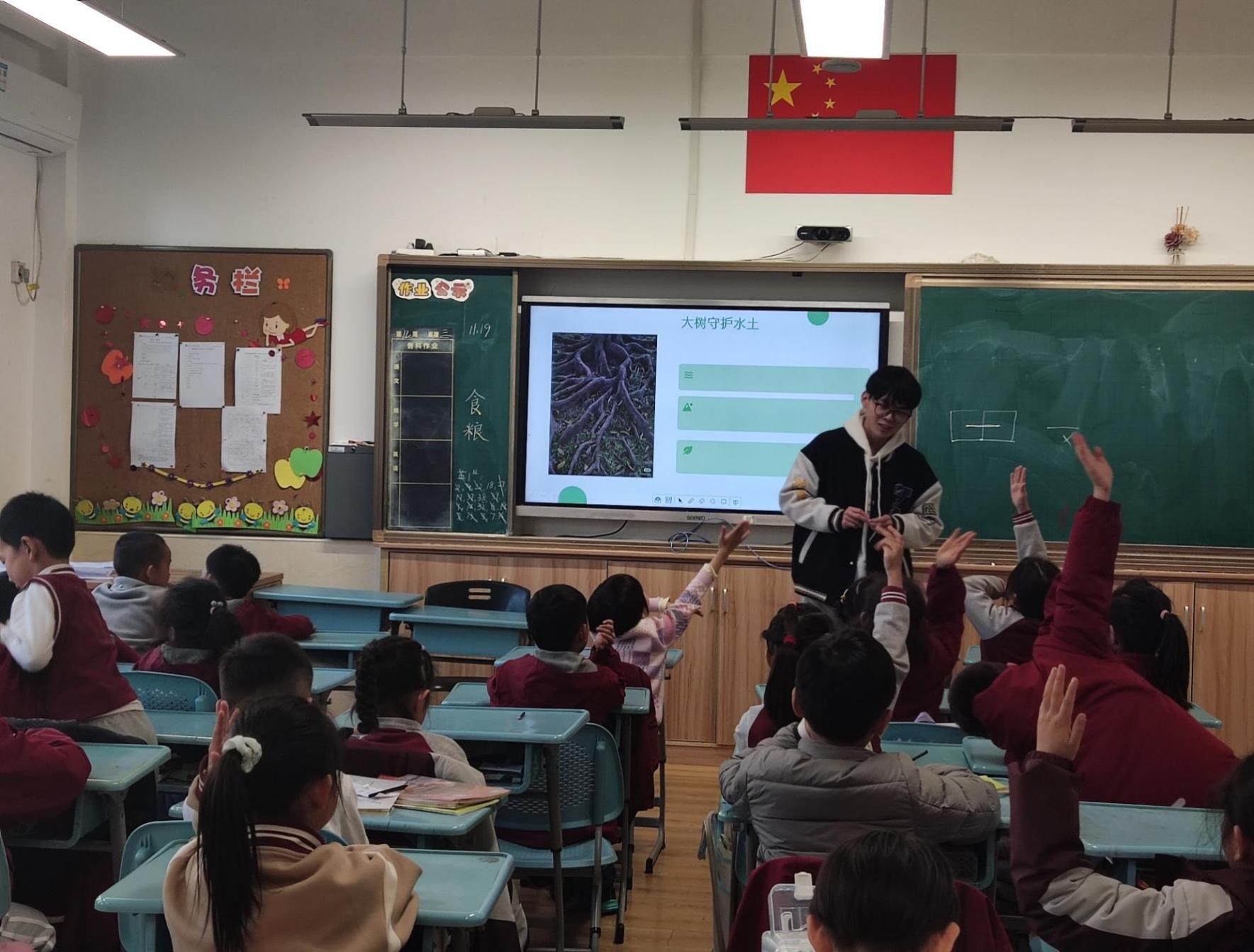讲师们通过讲解大树与动物、土壤、人类的关系,以简单易懂的方式为同学们解释了树木在生态系统中处于一个怎样的位置,它为我们带来了什么?同学们积极地向讲师提出疑惑并主动学习。讲师们也耐心地解答同学们的问题。课堂充满了主动探索的氛围。
