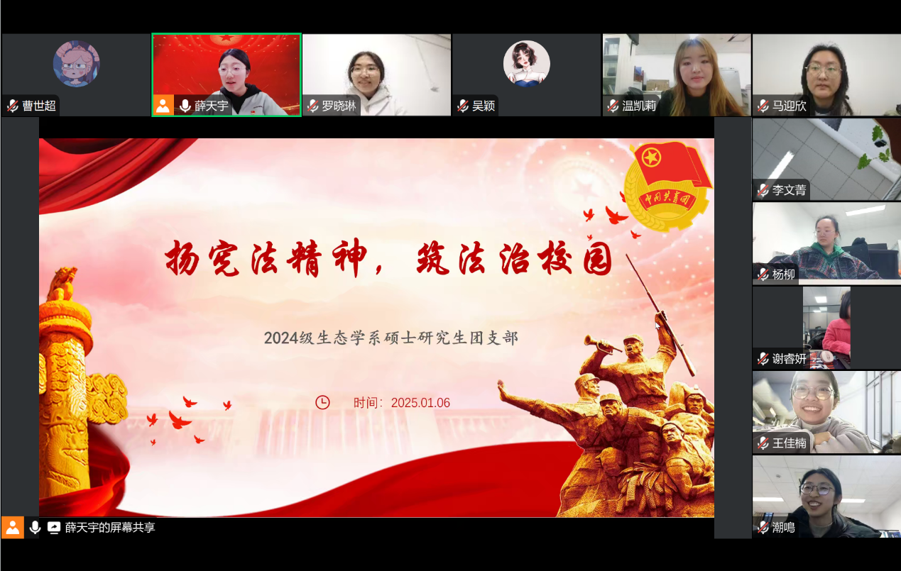 良法善治,民之所向。在法治社会建设进程中,宪法作为国家根本大法,规定了国家的根本制度和根本任务,是维护国家统一、民族团结、社会稳定的法律基础。为深入学习贯彻宪法精神,强化学生法治观念,厚植校园法治文化,2025年1月6日,暗网视频 2024级生态学系硕士研究生团支部开展“扬宪法精神,筑法治校园”主题教育活动。