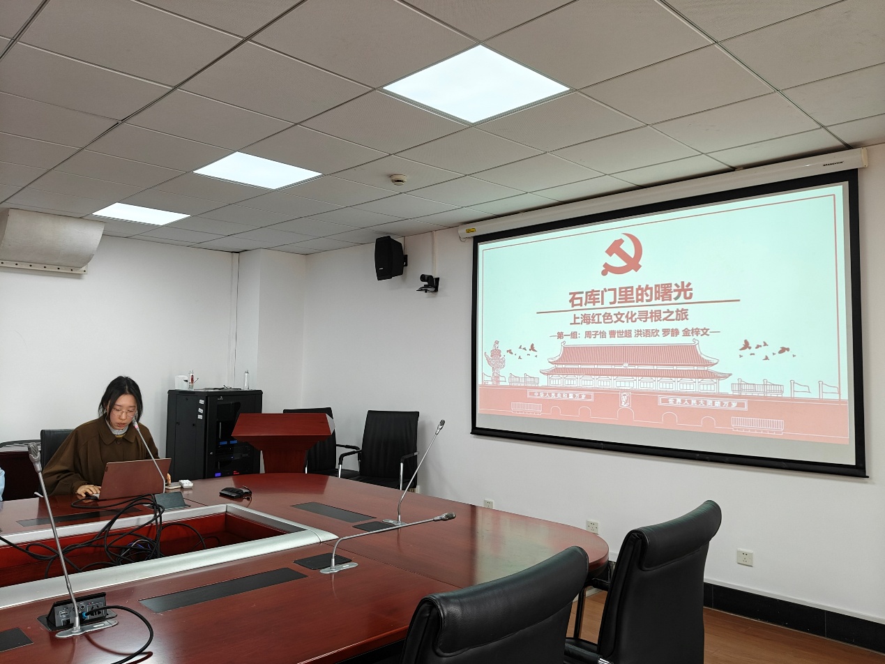 第一小组的洪语欣同学以“石库门里的曙光——上海红色文化寻根之旅”为主题展开分享,生动形象地讲述了中央特科在隐蔽战线的英勇斗争以及李白烈士的潜伏事迹、龙华烈士陵园的历史、百代小楼和《义勇军进行曲》的渊源、杨浦滨江工业带的变迁以及优秀工人黄宝妹的事迹,多维度讲述了上海深厚的红色文化。