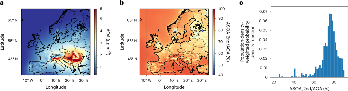 在此基础上,该研究更新了空气质量模型的芳香烃氧化生成SOA参数,进而在区域尺度评估了二次氧化过程对欧洲人为源有机气溶胶的贡献,发现欧洲超过70%的人为源有机气溶胶(AOA)暴露来自二次氧化过程(图2)。二次氧化过程导致远离排放源的郊区同样受到影响。由于二代氧化产物相较其他有机气溶胶组分有着更高的氧化等级,其对人类健康的影响更为显著,未来需要制定更为严格的芳香族化合物减排政策来保障人类健康。