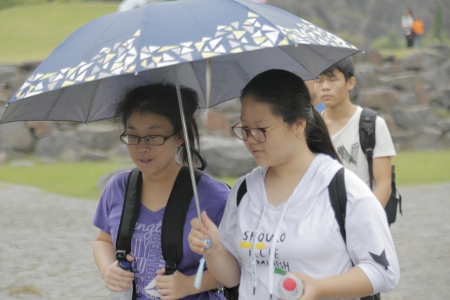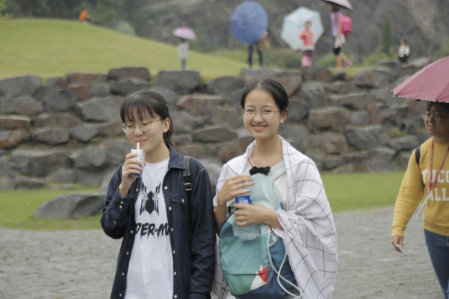 同学们“成双成对”地漫步在细雨中