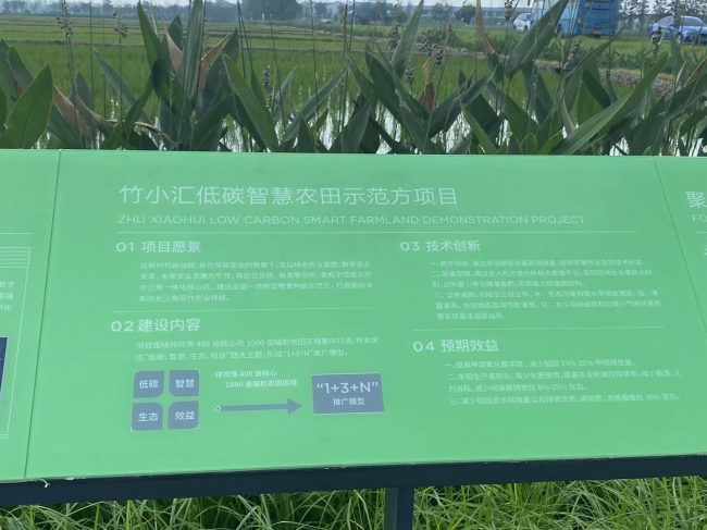 我们还对竹小汇低碳智慧农田示范项目进行了调研,在此我们对如何减少化肥施用量进行了探讨,了解了“沼液还田”等举措;在田边还设有生态沟渠,沟渠中生长着大量水生植物,用于对农田退水中的污染物进行吸收,进而实现尾水减碳排放;在田块之间,还设有由秸秆铺成的田间小道,对于秸秆,我们还思考了秸秆的资源化利用,可制备生物炭、堆肥等资源。最后我们进行了稻田甲烷减排的思考,如何采用措施阻止甲烷的产生,是否可以通过调控稻田中的微生物菌群来实现等。
