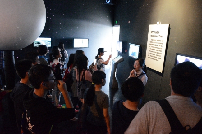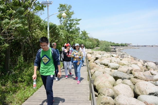 进入吴淞炮台湾湿地森林公园,大家径直来到位于其内的长江河口科技馆。长江河口科技馆是以介绍河口自然环境、科技应用和人文景观知识为主题的一座科技馆,是宝山区政府与我校合作的重点项目之一。大家在讲解员的引领下依次参观了序厅、第二展厅资源与环境厅、第三展厅科研与应用厅、第四展厅人文与历史厅,同时还观看了四维动感影片《吴淞风云》。参观后,大家沿着黄浦江江边往回走,远眺长兴岛,感受长江河口的原生态自然风貌。