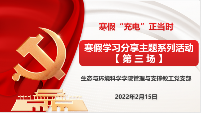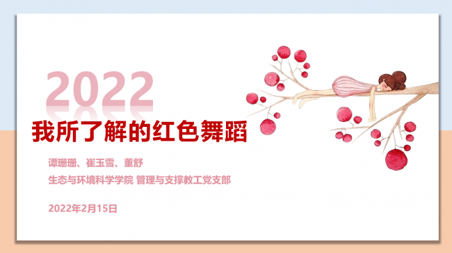 2022年2月15日下午,生环学院管理与支撑教工党支部举办第三场寒假学习分享主题活动,分享人是董舒、谭珊珊、崔玉雪、姚芳芳、宋萌和杨海波老师。董舒、谭珊珊、崔玉雪三位老师组成小组,分享的主题是《我所了解的红色舞蹈》;姚芳芳老师分享的主题是《梦想与成长——<心灵奇旅>观后感》、宋萌老师分享的主题是《传承与突破——感受2022年北京冬奥会》、杨海波老师分享的主题是《人类群星闪耀时读后感》。