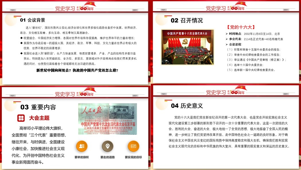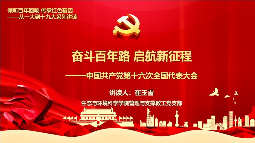 第十四讲“奋斗百年路,启航新征程——中共十六大历史回顾”由管理与支撑教工党支部党员崔玉雪讲读。崔玉雪老师为大家详细介绍了中共十六大的召开背景、召开情况、会议内容及其重要意义。十六大是我们党在新世纪召开的第一次代表大会,也是党在开始实施社会主义现代化建设第三步部署的新形势下召开的一次十分重要的代表大会。大会全面回顾了党的十五大以来5年的工作,系统总结了党的十三届四中全会以来13年奋斗历程和基本经验;把“三个代表”的重要思想确立为党的指导思想;提出全面建设小康社会的新目标。同时大会着眼于党的兴旺发达和国家长治久安,顺利实现了中央领导集体的新老交替。十六大极大地统一了全党的思想,振奋了全国人民的精神,对于确保我们胜利实现社会主义现代化的目标和中华民族的伟大复兴,具有重要的现实意义和深远的历史意义。