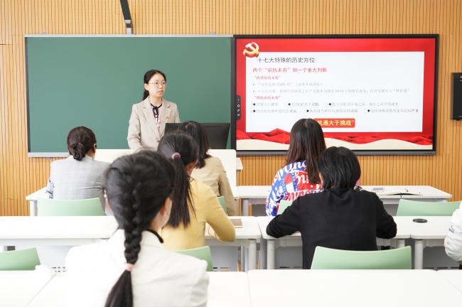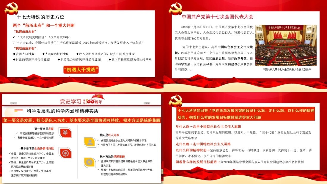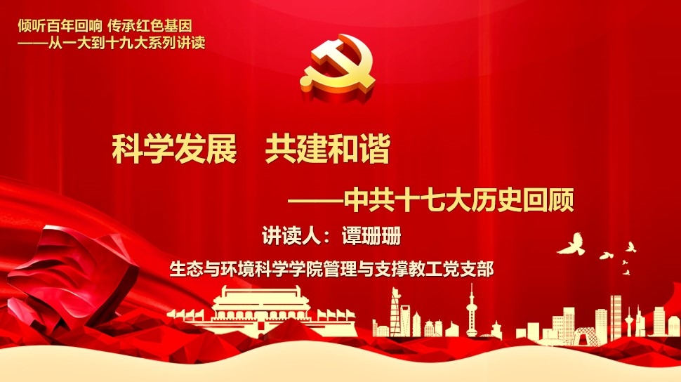 第十五讲“科学发展 共建和谐——中共十七大历史回顾”由管理与支撑教工党支部党员谭珊珊讲读。谭珊珊老师从十七大特殊的历史方位、会议主要内容和十七大报告的十八个亮点以及科学发展观的科学内涵等方面为大家详细介绍了中国共产党第十七次全国代表大会的历史意义。胡锦涛在大会报告中首先总结了改革开放的伟大历史进程,并指出改革开放是决定当代中国命运的关键抉择,是发展中国特色社会主义、实现中华民族伟大复兴的必由之路。中共十七大还对科学发展观的科学内涵、精神实质和根本要求进行了全面系统的阐述,并将科学发展观新增入党章。中共十七大科学的回答了党在改革发展关键阶段举什么旗、走什么路,以什么样的精神状态、朝着什么样的发展目标继续前进等重大问题,勾画了我国未来改革发展的宏伟蓝图,表明了我们党继续推进中国特色社会主义伟大事业的坚定决心和信心。