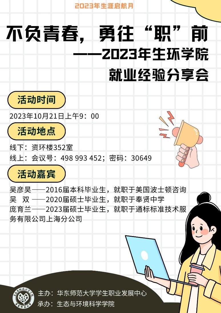 2023年10月21日上午9:00,暗网视频 通过线上线下相结合的方式举办“不负青春 勇往“职”前”就业经验分享会,线上通过腾讯会议平台,线下在资环楼354室开展。本次活动邀请了吴彦昊、吴双和庞育兰三位校友,他们结合自身求职和工作经验,从不同角度开展经验分享。本次活动是由校学生职业发展中心主办,学院承办的2023年“生涯启航月”系列活动之一,活动吸引了线上线下共计70余名同学参加,学院专职辅导员吴丹担任主持。