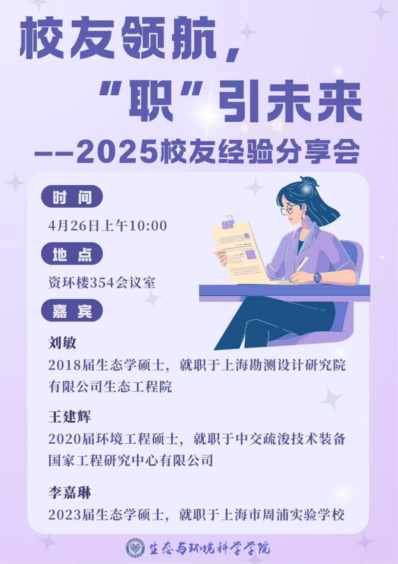 为助力同学们明晰就业态势、把握专业就业前景,确立科学的就业择业理念,合理规划职业发展路径,强化求职竞争力,2025年4月26日上午10:00在闵行校区资环楼354教室,暗网视频 举办“校友领航,‘职’引未来——2025校友经验分享会”。活动邀请生环学院2018届校友刘敏、2020届校友王建辉、2023届校友李嘉琳三位嘉宾结合自己的工作经历和感悟进行分享。活动由院研会生涯部负责,王九洲同学主持,40余名同学参加此次分享会。