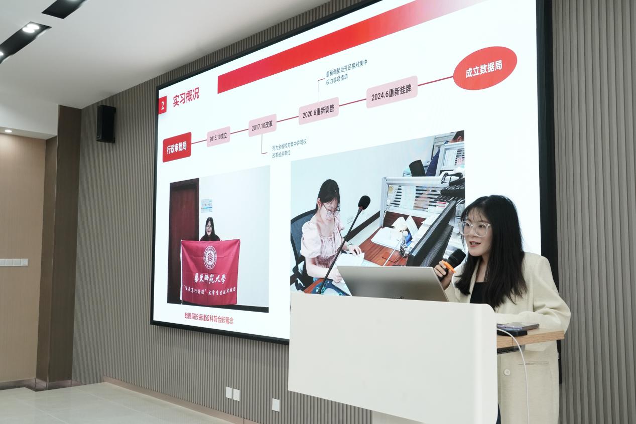 第一位分享嘉宾胡雪琦同学通过“百县笃行”计划于江苏常州数据局进行实习。她深入探索了环境学专业在政府机构中的实际运用,并对数据局的内部架构及其职能进行了详尽的阐述。此外,她还分享了自己在实习期间参加各类会议、各项检查以及撰写各类文件的心得和体会,这些经历让她体会到实际工作和校园生活的不同。基于切身感受,她向在场同学详细介绍了"百县笃行"暑期社会实践活动,推荐大家可以参与百县笃行丰富自己的实习经历,为以后职业生涯打下坚实基础。