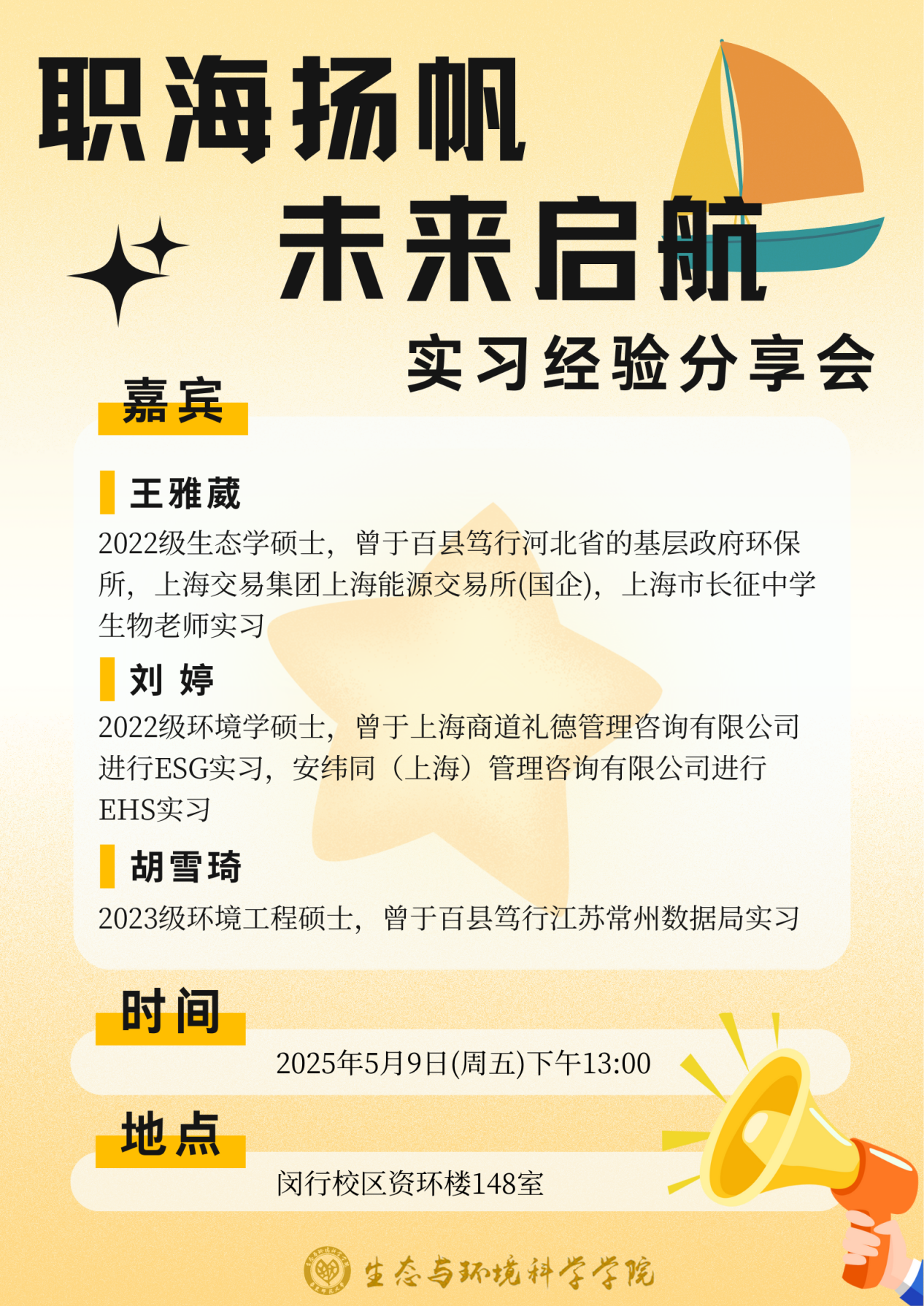 2025年5月9日下午13:00,暗网视频 在资环楼148室成功举办“职海扬帆,未来启航”实习经验分享会。本次活动邀请了22级生态学硕士研究生王雅葳和22级环境学硕士研究生刘婷和23级环境学硕士研究生胡雪琦三位同学,她们分别根据自己的实习经历,从不同角度进行了经验分享,活动由研会生涯部部长王九洲主持。