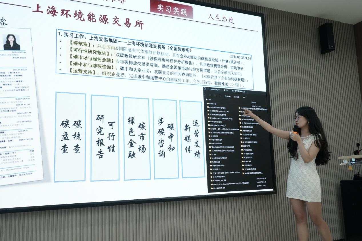 第二位分享嘉宾王雅葳同学曾实习于河北省的基层政府环保所、上海交易集团旗下的上海能源交易所以及上海市长征中学。她以亲身经历为例,从政府机构、国有企业和教师编制三个不同方向,分享了各自的实习感受。她强调了实习经历的重要性,表示实习工作能够使我们有更真实的职场体验,帮助我们更好地了解自己的兴趣和能力所在,从而做出更为合理的职业规划,增加我们在未来就业市场上的竞争力。