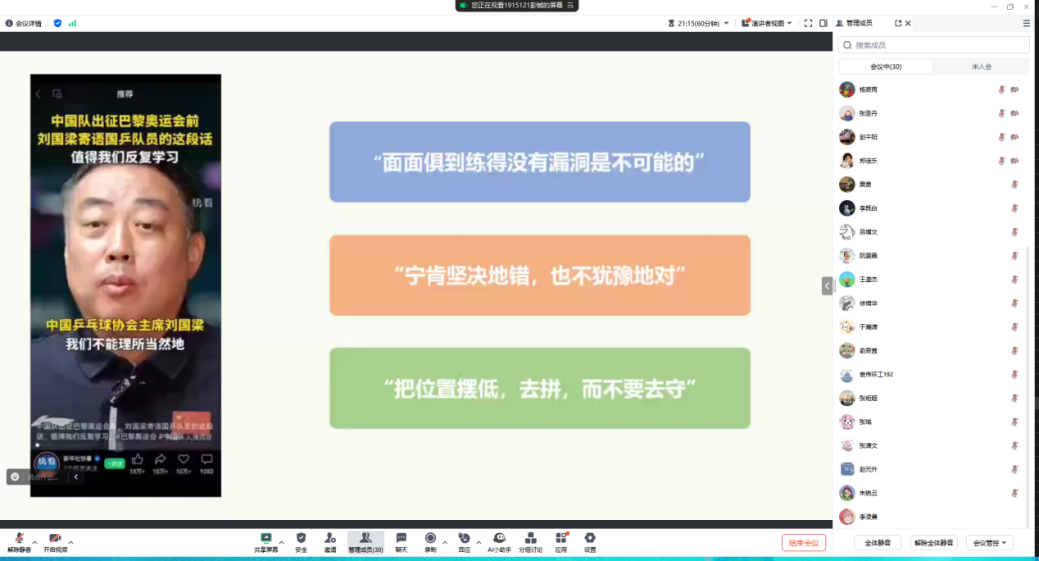 通过这次分享,大家收获颇丰,从巴黎奥运会中国运动员的每一次登场、每一次突破、每一枚奖牌中,我们看到了团队拼搏奋斗的精神,这展现着团队协作的意志,体现着团队的凝聚力和战斗力。在竞争日益激烈的奥运赛场,强大的团队、团结的力量是实现奥运梦想的重要基石。