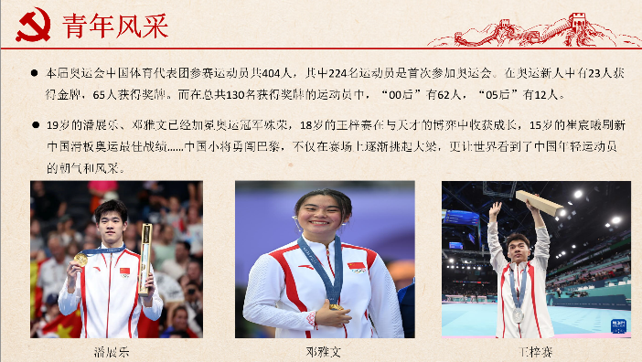活动第三部分,黄勇向大家分享了我国在巴黎奥运会取得的优异成绩,尤其突出了奥运会上的青年风采。分享中提到,本届奥运会中国体育代表团参赛运动员共404人,其中224名运动员是首次参加奥运会。在奥运新人中有23人获得金牌,65人获得奖牌。而在总共130名获得奖牌的运动员中,“00后”有62人,“05后”有12人。19岁的潘展乐、邓雅文已经加冕奥运冠军殊荣,18岁的王梓赛在与天才的博弈中收获成长,15岁的崔宸曦刷新中国滑板奥运最佳战绩……中国小将勇闯巴黎,不仅在赛场上逐渐挑起大梁,更让世界看到了中国年轻运动员的朝气和风采。乒乓球男团、女团决赛,国乒分别遇到瑞典队、日本队的全力阻击,队中每个人都以“团结一心、为国而战”为激励,汇聚个人力量,成就集体荣光——“六金王”马龙成为中国队奥运史上获得金牌最多的选手,无愧“传奇”之名;“劳模”王曼昱每场团体赛既要双打,又要单打以减轻队友负担。