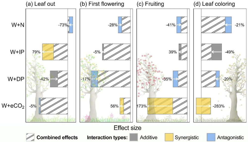 植物物候对物种分布、生态系统结构与功能及陆地生态系统碳、水、能量平衡具有重要作用。已有研究表明植物物候对气候变化响应敏感,但多种全球变化因子对植物物候的影响是否存在交互作用尚不明确。