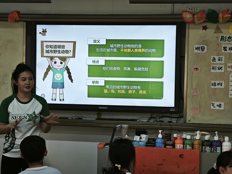 课程开始,讲师们通过展示麻雀、松鼠、鼠妇、青蛙等城市野生动物图片,结合生动讲解,引导同学们观察不同动物的外形特征、生活习性,帮助大家认识这些 “城市小邻居”。