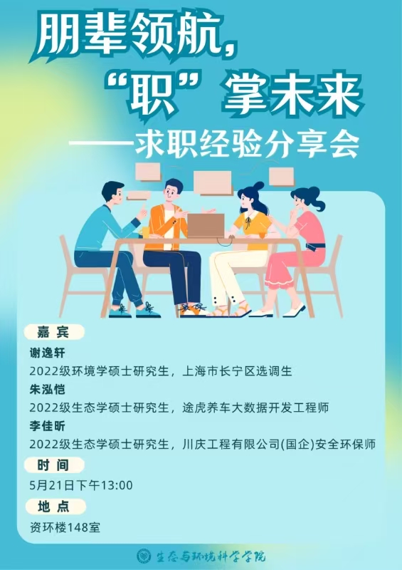 2024年5月21日,生环学院研究生会携手2023级生态学和环境学硕士研究生团支部,举办“朋辈领航,‘职’掌未来——求职经验分享会”。此次活动特邀2025届毕业生李佳昕、谢逸轩和朱泓恺三位同学,为学弟学妹们倾囊相授求职路上的宝贵经验与实用技巧。