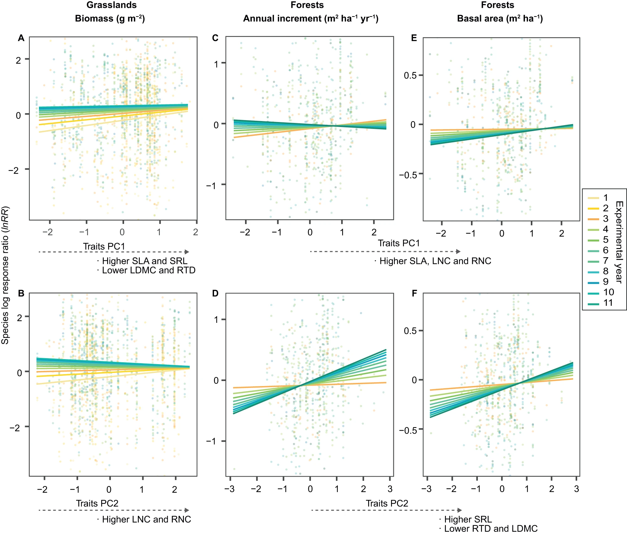 图3. 物种水平(从资源保守型一端到资源获取型一端)超产随时间推移而变化
