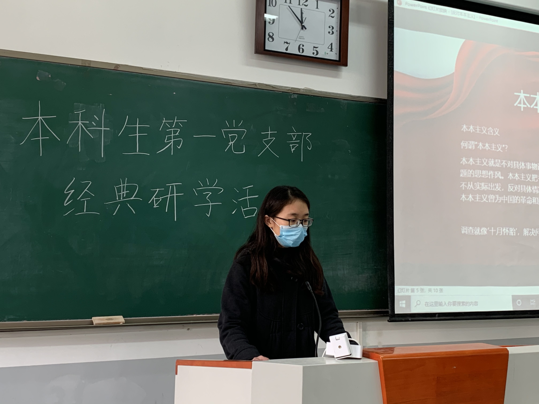 学生党员谢美宁首先向全体党员详细地介绍了《反对本本主义》一文的写作背景、主要内容和《反对本本主义》所强调的调查方法和调查研究所具有的重要地位。并和与会党员一同回顾了20世纪二三十年代我党的经历,播放相关视频展示了老一代共产党人对党的拥护和支持,让与会党员对《反对本本主义》著作相关内容了解得更加深入,在字里行间领悟信仰的力量。