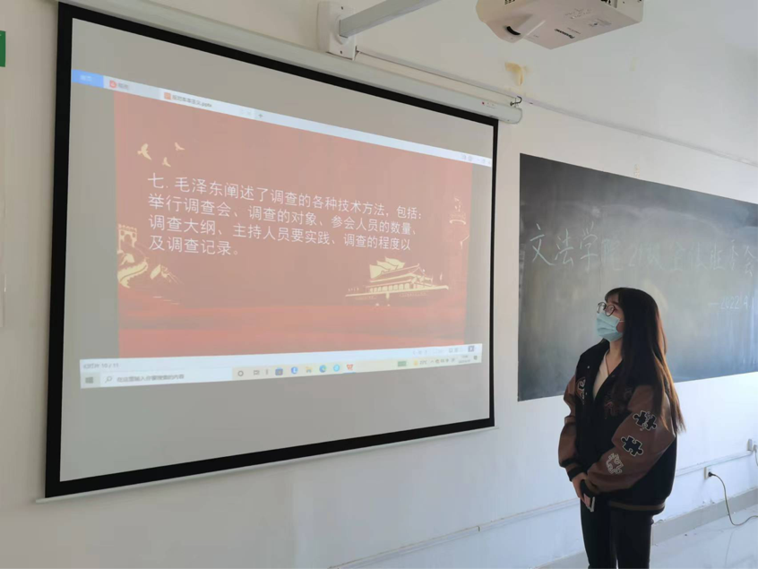 学生党员庞景羽先向大家分享了《反对本本主义》的基本思想,其基本思想是实事求是,没有调查就没有发言权。接着庞景羽同学为大家介绍了《反对本本主义》的写作背景,《反对本本主义》是毛泽东为了反对红军中的教条主义思想而写的,其原名叫做《调查工作》,是毛泽东时间较早的马克思主义著作。最后庞景羽同学为大家介绍了《反对本本主义》中的前三个主题,毛泽东在前三个主题中对调查进行了详细的描述,还指出了党内存在“本本主义”的错误思想。