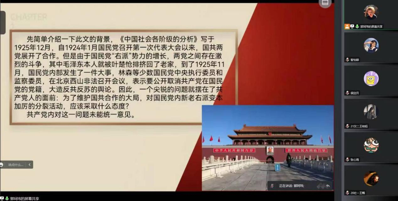 学生党员郭珂玮分享了毛泽东选集第一卷中的《中国社会各阶级分析》。他首先从此文的背景入手,《中国社会各阶级的分析》写于1925年12月,为了维护国共合作的大局,对国民党内新老右派变本加厉的分裂活动,应该采取什么态度?共产党内对这一问题未能统一意见。他介绍了毛泽东同志对五个阶级的具体分析,接着介绍了对于本文给我们一些启示。我们要认真学习毛泽东选集,用心体会其中的真谛。