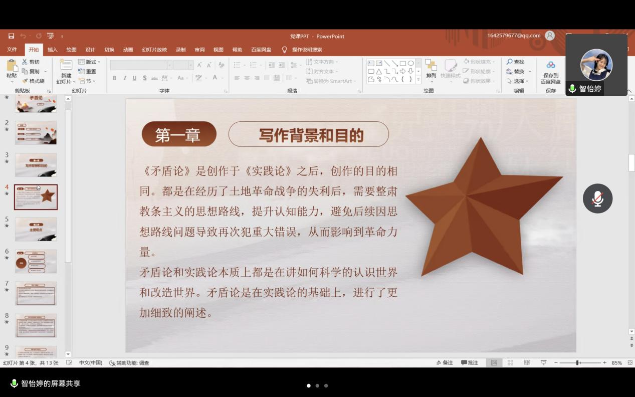 学生党员智怡婷与大家共同学习了《矛盾论》。她先从写作背景入手,说明《矛盾论》是针对整肃教条主义,提高认知能力而写的。之后智怡婷同学又从两种宇宙观、矛盾的普遍性和特殊性、矛盾的不平衡性、矛盾的同一性和斗争性四个角度基本概括了主要观点。除此之外,智怡婷同学还介绍了在读完《矛盾论》后,给她带来的现实价值,提供好的习惯,从个性中发现共性规律,进而应用到其他问题中;抓主要矛盾,集中精力做好一件事;乐观精神,辩证的看待事物的发展和自身未来发展!
