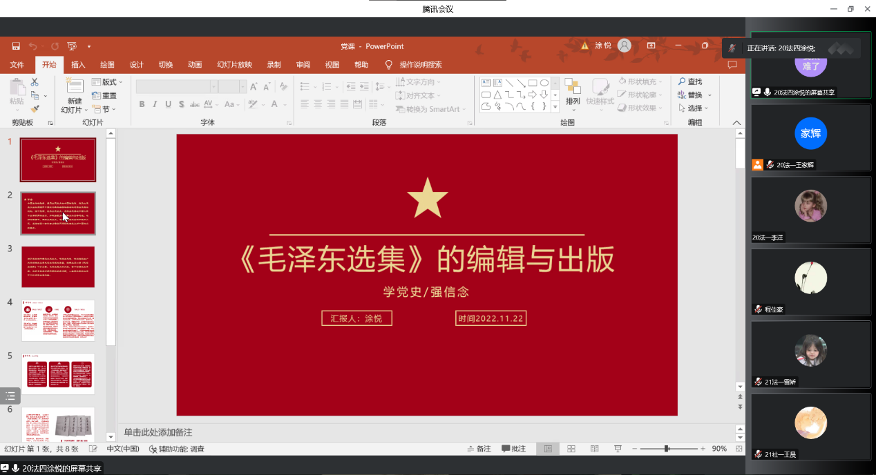 本科生第二支部学生党员涂悦以《毛泽东选集》的编辑与创作为背景,介绍了《毛泽东选集》不同部分创作的背景以及故事,带领党课中的党员与积极分子深入学习其中的意义,充实学生党员与积极分子的知识和提高其阅读兴趣。