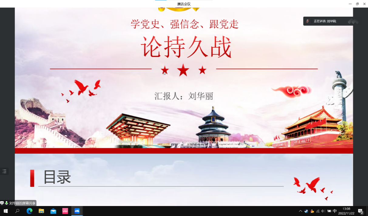 学生党员刘华丽以《论持久战》为主题为大家做分享报告,主要从背景、内容及其历史意义展开介绍。