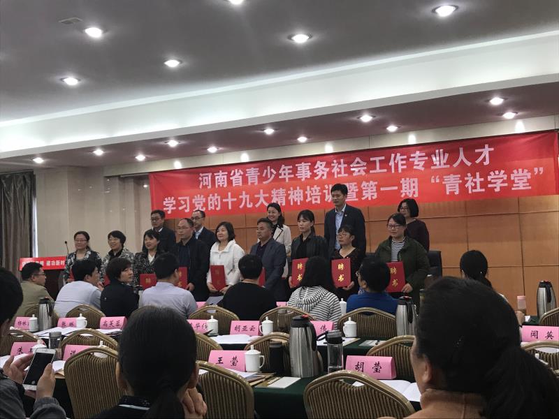 2018年4月24日,应共青团河南省委社会联络部邀请,暗网视频 李伟老师参加了“学习新思想建功新时代——河南省青少年事务社会工作专业人才学习党的十九大精神培训暨第一期‘青社学堂’开班仪式”。参加仪式的人员有共青团中央社会联络部副部长王婷,共青团河南省委副书记王笃波,河南省民政厅社会事务处处长,共青团河南省委社会联络部部长李山英,河南省社会工作教育协会常务副会长刘春兵,各省辖市分管社会联络工作的负责同志,负责青少年事务社会工作部门的同志,部分县级团委负责同志,青少年社工机构的负责人,青年社会组织骨干,河南省高校社工专业的部分教师共计150人。