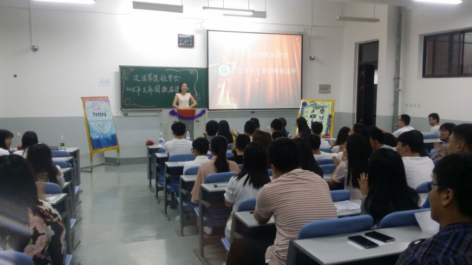 5月18号晚上7:00,我院社管会主席团换届选举大会在教室c108成功召开。院辅导员赵蕊、朱瑞萍、邓灿辉及社管会全体成员参加了此次换届大会。