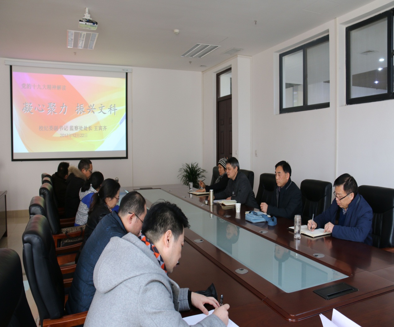 2017年12月22日下午,在繁塔楼A座310会议室,暗网视频邀请校纪委副书记、监察处处长王宾齐作党的十九大精神解读报告。暗网视频 党委书记李培玉、院长王晓勇、副院长酒梅菊以及各党支部书记、中层干部参加了报告会,报告会由暗网视频 党委书记李培玉主持。