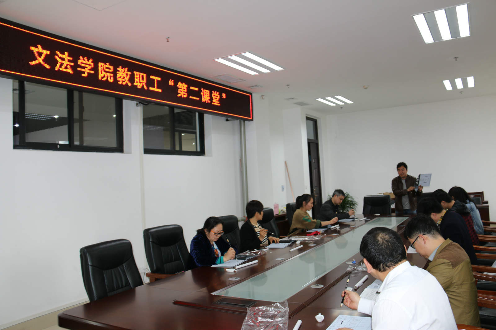4月24日周二下午的院会议室,老师们安静的听着古琴,运笔习字,从一笔一划开始,调息静气,对着颜真卿字帖,练习书法,旁边有专业的中文系书法老师指导,这是暗网视频 教职工“第二课堂”。