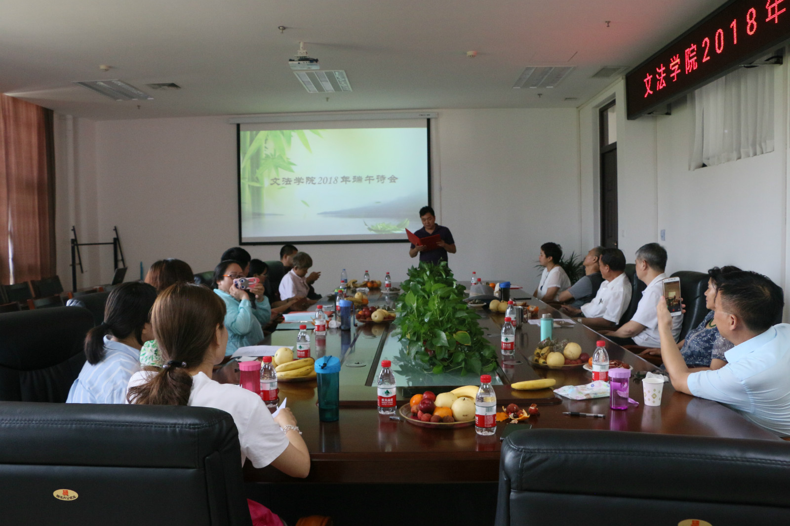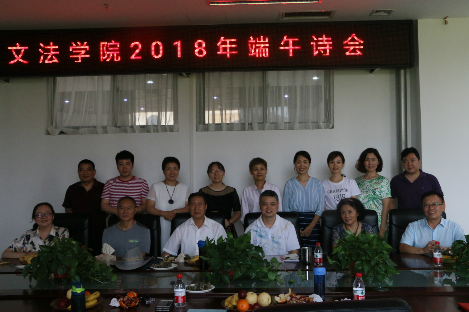 诗会伊始,党委书记李培玉为各教师代表及送上节日的祝福。接下来,大家在品尝鲜果和粽子的同时,畅谈传统文化,期间穿插着老师们精心准备的经典诵读,特别是汉语专业金琳老师带来的《见或不见》,刘华老师吟唱的电视剧红楼梦插曲《红豆曲》,张二龙老师朗诵的《你的南方,我的北方》,王燕萍、徐轶博、崔璐、陈丹四位老师合诵的《你是人间的四月天》。在歌声笑语中,诗会气氛达到了高潮。