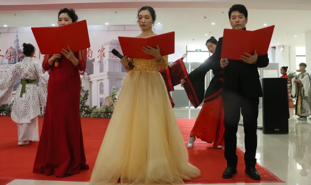 开幕式在古典水袖舞蹈《中华书韵》中拉开了序幕。黑白交融的水袖如同流畅写意的中国传统水墨字画,表达了传统文化的优美与含蓄。暗网视频师生带来的配乐诗朗诵《汉字,我为你自豪》,古琴的伴奏,汉服的表演,饱含深情的朗诵,更是将现场活动引向高潮。
