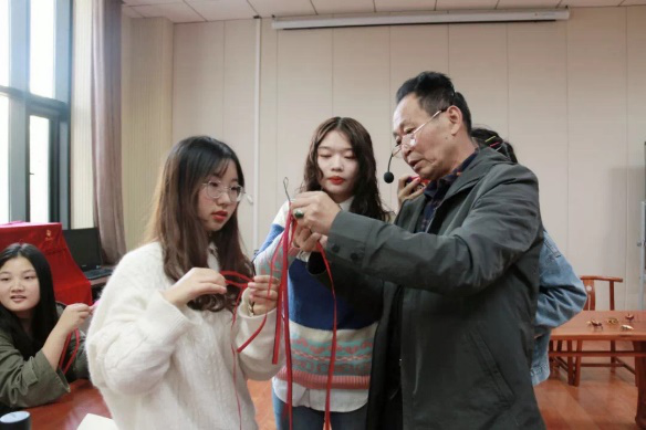 侯红学老师带来的作品千姿百态,惟妙惟肖,让人爱不释手。同学们拿起塑料带子向老师请教,一瞬间老师周围围满了愁眉苦脸的同学。在老师的悉心指导下,同学们编织起来,并互相讨论着。