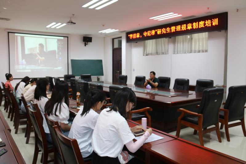 张二龙作“学规律,守纪律”研究生管理制度培训。他讲解了学籍信息完善方法和研究生课程学习要求,向研究生提出两点建议,一要主动联系导师,加强沟通交流;二要对自我学习高标准严要求。