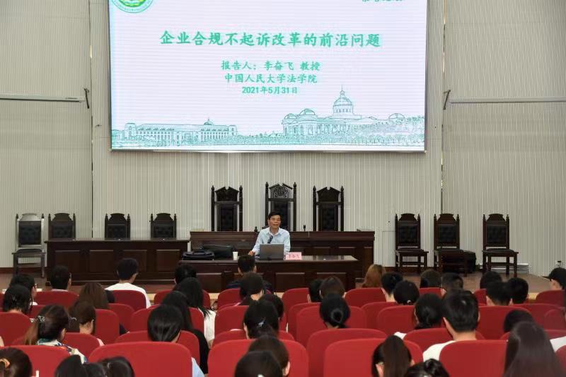 近300名师生参加报告会。会上,李奋飞以“企业合规不起诉改革的前沿问题”为题,重点从“改革的正当根据”“改革的争议问题”“改革的未来展望”三个方面,对企业合规的含义,尤其对近期检察机关推行的企业合规相对不起诉改革,进行了全面细致的解读。结合企业合规概念的,李奋飞重点介绍了传统的企业犯罪治理模式所存在的诸多弊端,特别是结合“快播案”等部分影响性案例,阐述刑事追诉可能给涉案企业乃至公共利益带来的负面影响。他认为,企业以刑事合规计划换取宽大处理在很大程度上改变了检察机关在企业犯罪治理中的传统角色,有助于激励企业建立一种防范、识别和应对违法违规机制的机制,对于预防、消除企业再次实施违法犯罪行为,进而减少、避免刑事诉讼给公司、股东乃至社会带来的殃及效果,具有非常积极的意义,对我国刑事诉讼理论的发展产生深刻影响。
