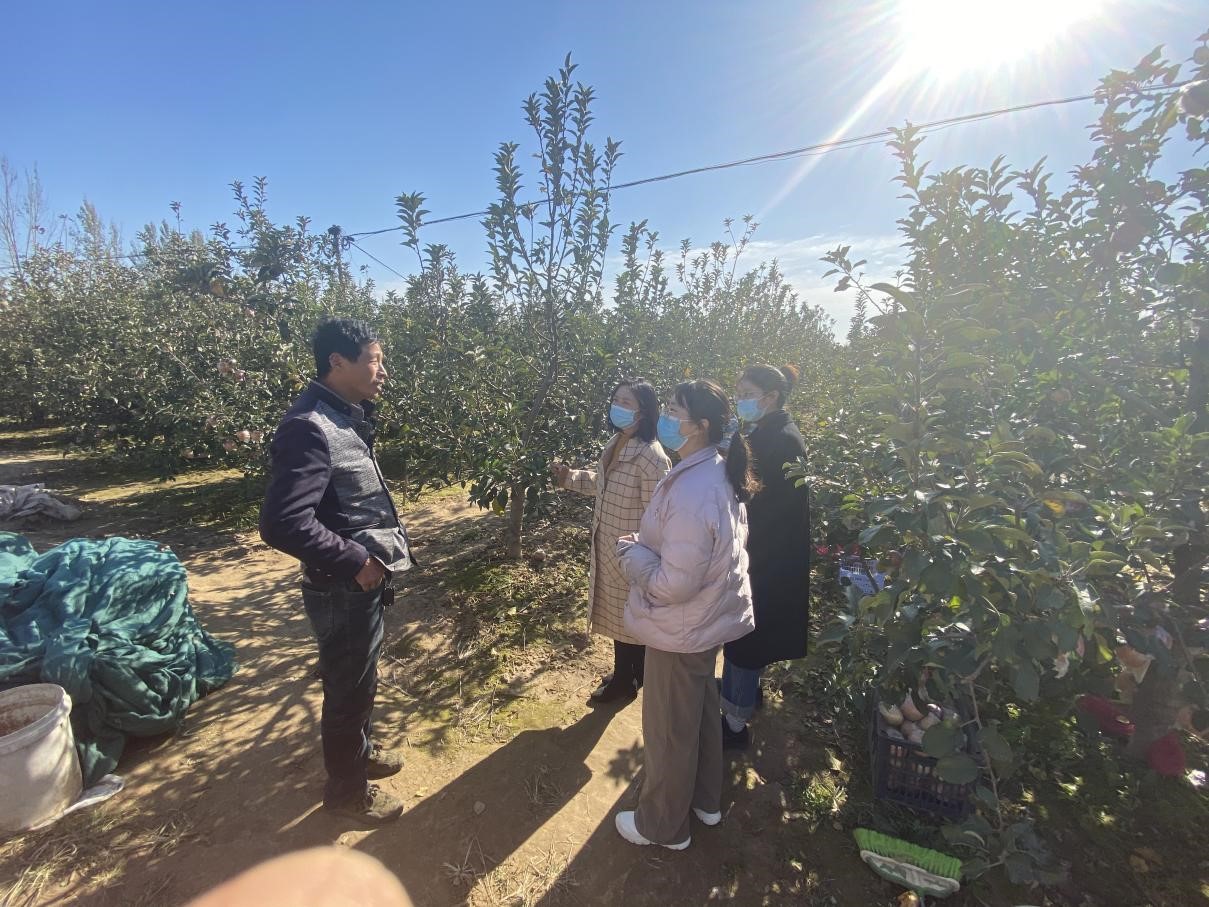 调研期间,通过与中牟县雁鸣湖镇文化服务中心座谈,了解农村社会工作参与乡村治理项目的进展情况;与农村社会工作服务的在地社工、志愿者、村民访谈,了解当地农户的生活、生产情况。此后,在朱固社区社会工作项目主管董雪晨的引领下,调研团队一行又前往了黄河段苹果种植园区,与当地数十位果农进行访谈,详细了解了今年苹果的种植情况、果农需求和果农对当前乡村振兴等相关政策的了解。
