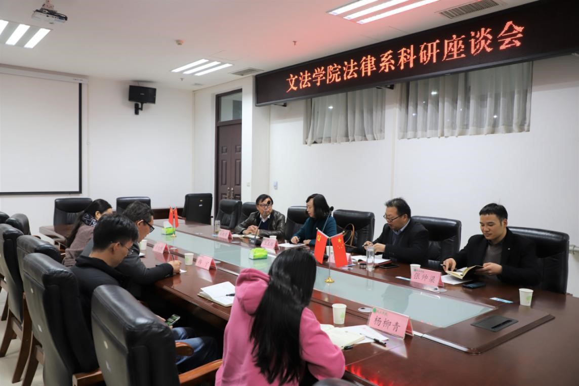 副院长、博士生导师王玉辉教授作主题交流。院长王晓勇、政策法规办副主任张帅梁、副院长杨红朝及法律系部分老师参与了交流会。交流会由杨红朝主持。