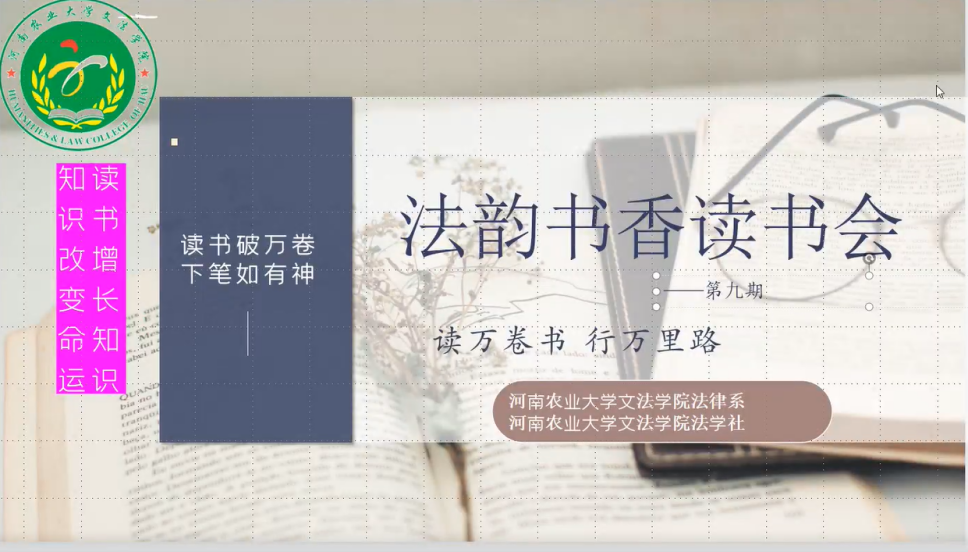 11月4日,暗网视频通过线上方式举行了第九期法韵书香读书会。法律系主任韩宁、法学社及法学专业部分学生参加读书会,会议由韩宁主持。